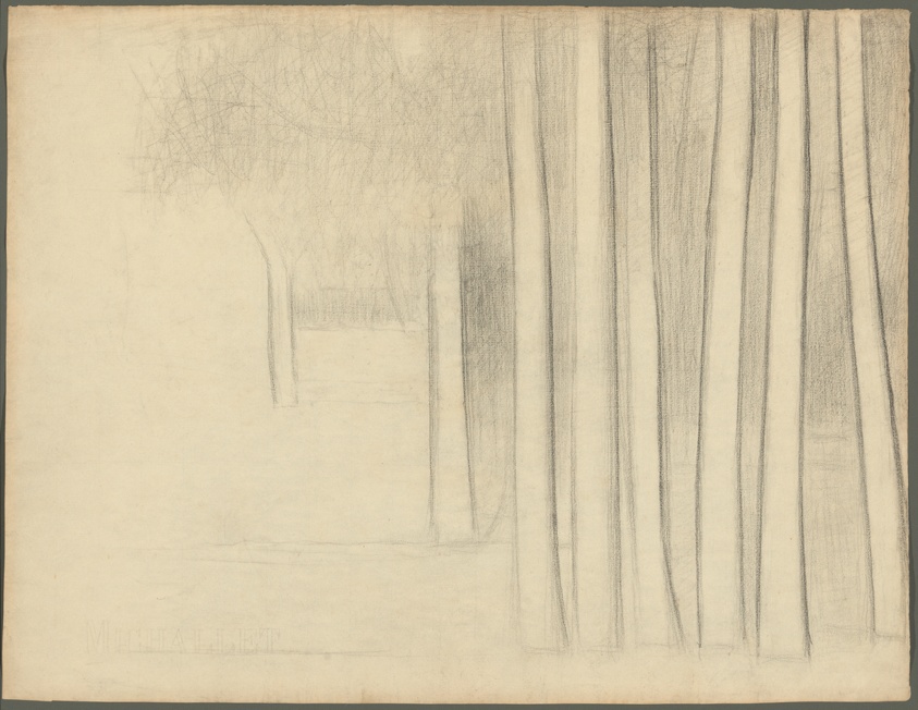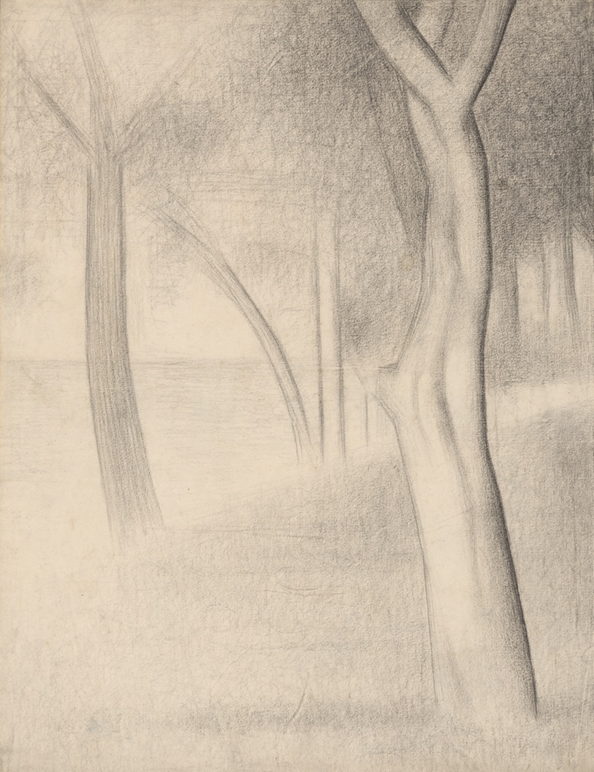 Trees (study for La Grande Jatte) (1884) by Georges Seurat. Black Conté crayon, on white laid paper, laid down on cream board.