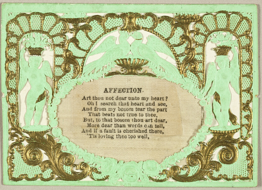 Valentine Affection (valentine) (1855/60) by Thomas Wood. Collaged element and gold and green paint on cut and embossed (designed) ivory wove paper.